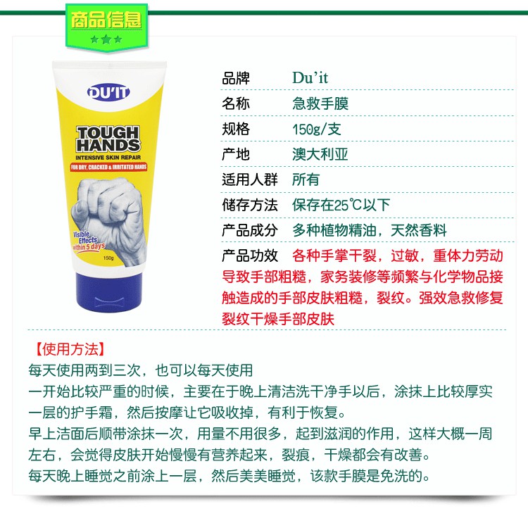 澳洲正品DUIT Tough Hands Intensive Repair 150ml急救手膜手霜